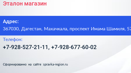 Эталон, магазин по адресу 367030, Дагестан, Махачкала, проспект Имама Шамиля, 57 в дальнейшем Организация, размещена в следующих категориях: