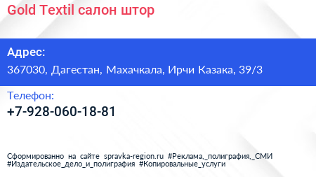 Gold Textil, салон штор по адресу 367030, Дагестан, Махачкала, Ирчи Казака, 39/3 в дальнейшем Организация, размещена в следующих категориях: