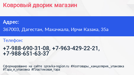 Ковровый дворик, магазин по адресу 367003, Дагестан, Махачкала, Ирчи Казака, 35а в дальнейшем Организация, размещена в следующих категориях: