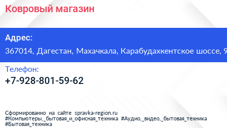 Ковровый магазин по адресу 367014, Дагестан, Махачкала, Карабудахкентское шоссе, 9 в дальнейшем Организация, размещена в следующих категориях: