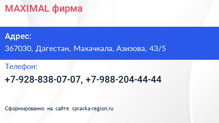 MAXIMAL, фирма по адресу 367030, Дагестан, Махачкала, Азизова, 43/5 в дальнейшем Организация, размещена в следующих категориях: