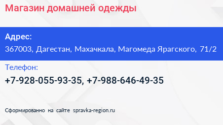 Магазин домашней одежды по адресу 367003, Дагестан, Махачкала, Магомеда Ярагского, 71/2 в дальнейшем Организация, размещена в следующих категориях: