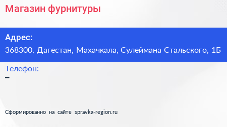 Магазин фурнитуры по адресу 368300, Дагестан, Махачкала, Сулеймана Стальского, 1Б в дальнейшем Организация, размещена в следующих категориях: