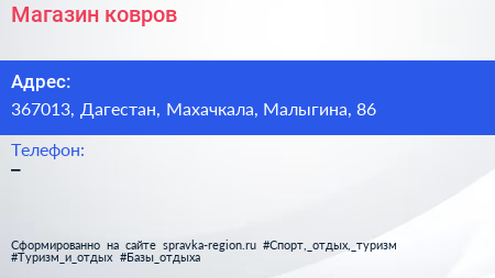 Магазин ковров по адресу 367013, Дагестан, Махачкала, Малыгина, 86 в дальнейшем Организация, размещена в следующих категориях: