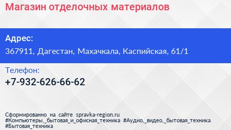 Магазин отделочных материалов по адресу 367911, Дагестан, Махачкала, Каспийская, 61/1 в дальнейшем Организация, размещена в следующих категориях: