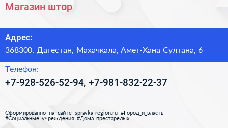Магазин штор по адресу 368300, Дагестан, Махачкала, Амет-Хана Султана, 6 в дальнейшем Организация, размещена в следующих категориях: