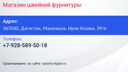 Магазин швейной фурнитуры по адресу 367030, Дагестан, Махачкала, Ирчи Казака, 39/6 в дальнейшем Организация, размещена в следующих категориях: