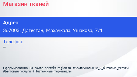 Магазин тканей по адресу 367003, Дагестан, Махачкала, Ушакова, 7/1 в дальнейшем Организация, размещена в следующих категориях: