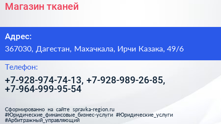 Магазин тканей по адресу 367030, Дагестан, Махачкала, Ирчи Казака, 49/6 в дальнейшем Организация, размещена в следующих категориях: