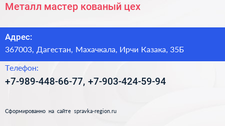 Металл мастер, кованый цех по адресу 367003, Дагестан, Махачкала, Ирчи Казака, 35Б в дальнейшем Организация, размещена в следующих категориях: