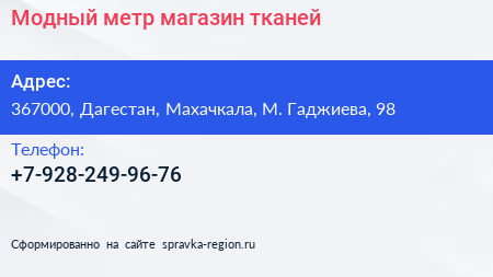 Модный метр, магазин тканей по адресу 367000, Дагестан, Махачкала, М. Гаджиева, 98 в дальнейшем Организация, размещена в следующих категориях: