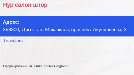 Нур, салон штор по адресу 368300, Дагестан, Махачкала, проспект Акулиничева, 3 в дальнейшем Организация, размещена в следующих категориях: