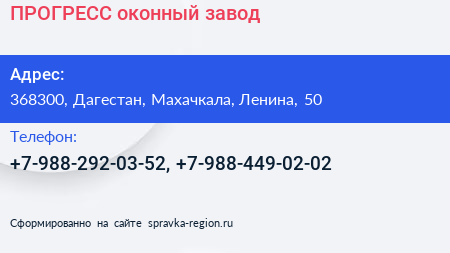 ПРОГРЕСС, оконный завод по адресу 368300, Дагестан, Махачкала, Ленина, 50 в дальнейшем Организация, размещена в следующих категориях: