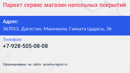 Паркет сервис, магазин напольных покрытий по адресу 367013, Дагестан, Махачкала, Гамзата Цадасы, 36 в дальнейшем Организация, размещена в следующих категориях: