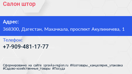 Салон штор по адресу 368300, Дагестан, Махачкала, проспект Акулиничева, 1 в дальнейшем Организация, размещена в следующих категориях: