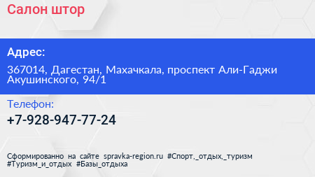Салон штор по адресу 367014, Дагестан, Махачкала, проспект Али-Гаджи Акушинского, 94/1 в дальнейшем Организация, размещена в следующих категориях: