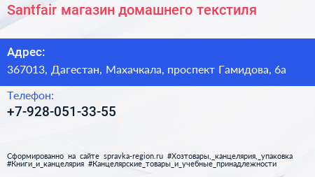 Santfair, магазин домашнего текстиля по адресу 367013, Дагестан, Махачкала, проспект Гамидова, 6а в дальнейшем Организация, размещена в следующих категориях: