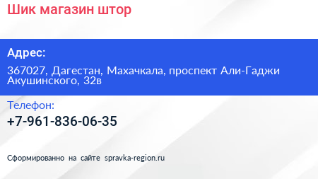 Шик, магазин штор по адресу 367027, Дагестан, Махачкала, проспект Али-Гаджи Акушинского, 32в в дальнейшем Организация, размещена в следующих категориях: