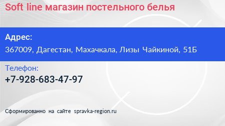 Soft line, магазин постельного белья по адресу 367009, Дагестан, Махачкала, Лизы Чайкиной, 51Б в дальнейшем Организация, размещена в следующих категориях: