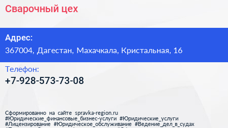 Сварочный цех по адресу 367004, Дагестан, Махачкала, Кристальная, 16 в дальнейшем Организация, размещена в следующих категориях: