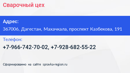 Сварочный цех по адресу 367006, Дагестан, Махачкала, проспект Казбекова, 191 в дальнейшем Организация, размещена в следующих категориях: