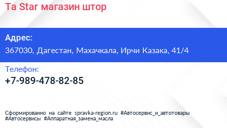 Ta Star, магазин штор по адресу 367030, Дагестан, Махачкала, Ирчи Казака, 41/4 в дальнейшем Организация, размещена в следующих категориях:
