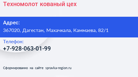 Техномолот, кованый цех по адресу 367020, Дагестан, Махачкала, Каммаева, 82/1 в дальнейшем Организация, размещена в следующих категориях: