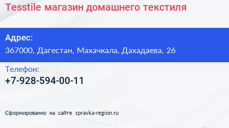 Tesstile, магазин домашнего текстиля по адресу 367000, Дагестан, Махачкала, Дахадаева, 26 в дальнейшем Организация, размещена в следующих категориях: