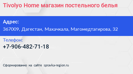 Tivolyo Home, магазин постельного белья по адресу 367009, Дагестан, Махачкала, Магомедтагирова, 32 в дальнейшем Организация, размещена в следующих категориях: