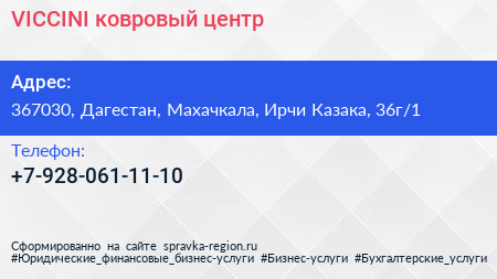 VICCINI, ковровый центр по адресу 367030, Дагестан, Махачкала, Ирчи Казака, 36г/1 в дальнейшем Организация, размещена в следующих категориях: