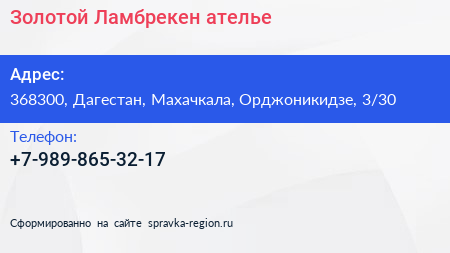 Золотой Ламбрекен, ателье по адресу 368300, Дагестан, Махачкала, Орджоникидзе, 3/30 в дальнейшем Организация, размещена в следующих категориях: