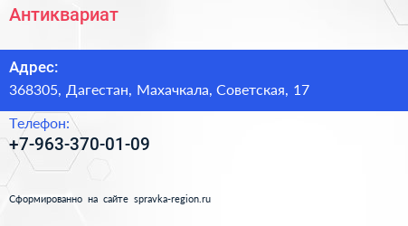Антиквариат по адресу 368305, Дагестан, Махачкала, Советская, 17 в дальнейшем Организация, размещена в следующих категориях: