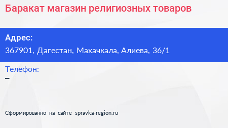 Баракат, магазин религиозных товаров по адресу 367901, Дагестан, Махачкала, Алиева, 36/1 в дальнейшем Организация, размещена в следующих категориях: