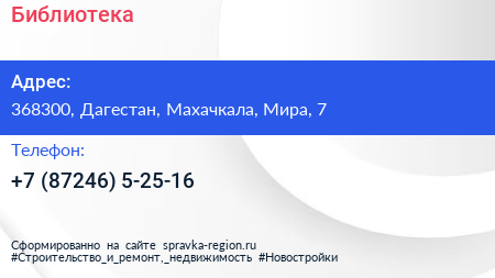 Библиотека по адресу 368300, Дагестан, Махачкала, Мира, 7 в дальнейшем Организация, размещена в следующих категориях: