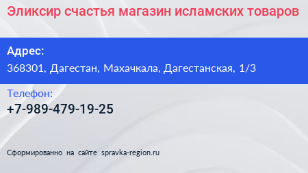 Эликсир счастья, магазин исламских товаров по адресу 368301, Дагестан, Махачкала, Дагестанская, 1/3 в дальнейшем Организация, размещена в следующих категориях: