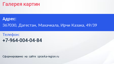 Галерея картин по адресу 367030, Дагестан, Махачкала, Ирчи Казака, 49/39 в дальнейшем Организация, размещена в следующих категориях: