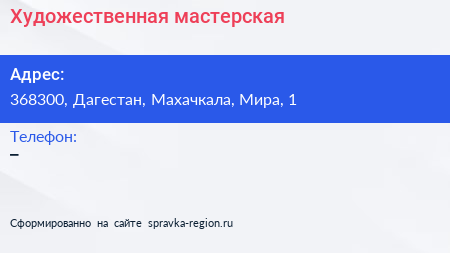 Художественная мастерская по адресу 368300, Дагестан, Махачкала, Мира, 1 в дальнейшем Организация, размещена в следующих категориях: