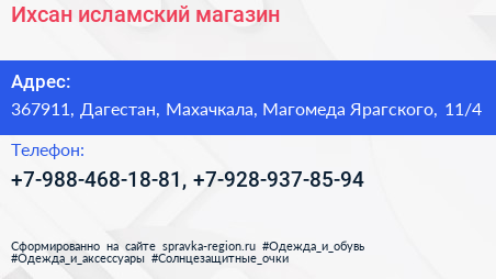 Ихсан, исламский магазин по адресу 367911, Дагестан, Махачкала, Магомеда Ярагского, 11/4 в дальнейшем Организация, размещена в следующих категориях: