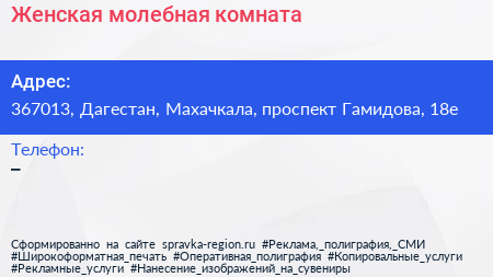 Женская молебная комната по адресу 367013, Дагестан, Махачкала, проспект Гамидова, 18е в дальнейшем Организация, размещена в следующих категориях: