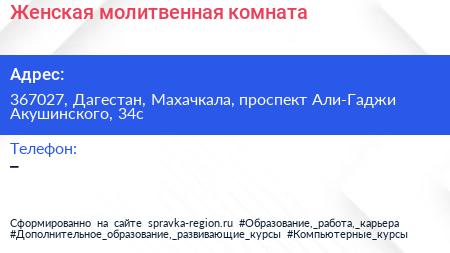Женская молитвенная комната по адресу 367027, Дагестан, Махачкала, проспект Али-Гаджи Акушинского, 34с в дальнейшем Организация, размещена в следующих категориях: