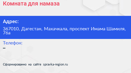 Комната для намаза по адресу 367010, Дагестан, Махачкала, проспект Имама Шамиля, 76а в дальнейшем Организация, размещена в следующих категориях: