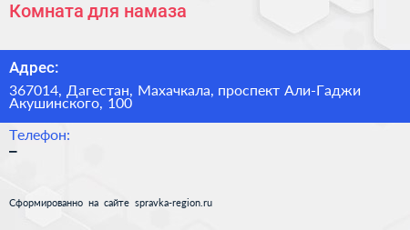 Комната для намаза по адресу 367014, Дагестан, Махачкала, проспект Али-Гаджи Акушинского, 100 в дальнейшем Организация, размещена в следующих категориях: