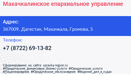Махачкалинское епархиальное управление по адресу 367009, Дагестан, Махачкала, Громова, 5 в дальнейшем Организация, размещена в следующих категориях: