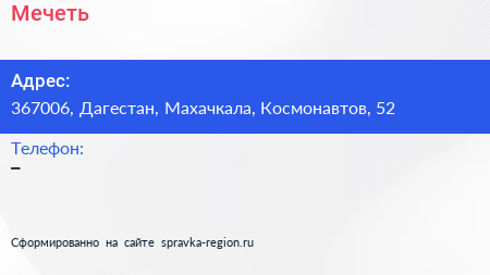 Мечеть по адресу 367006, Дагестан, Махачкала, Космонавтов, 52 в дальнейшем Организация, размещена в следующих категориях: