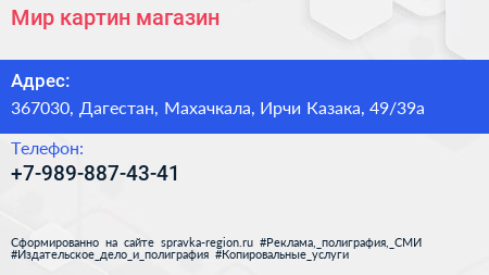 Мир картин, магазин по адресу 367030, Дагестан, Махачкала, Ирчи Казака, 49/39а в дальнейшем Организация, размещена в следующих категориях: