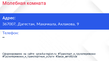 Молебная комната по адресу 367007, Дагестан, Махачкала, Ахлакова, 9 в дальнейшем Организация, размещена в следующих категориях:
