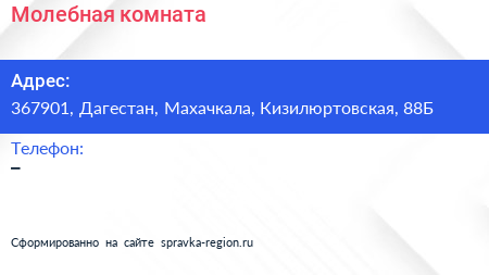 Молебная комната по адресу 367901, Дагестан, Махачкала, Кизилюртовская, 88Б в дальнейшем Организация, размещена в следующих категориях: