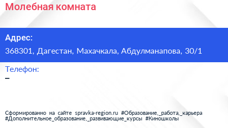 Молебная комната по адресу 368301, Дагестан, Махачкала, Абдулманапова, 30/1 в дальнейшем Организация, размещена в следующих категориях:
