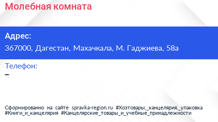 Молебная комната по адресу 367000, Дагестан, Махачкала, М. Гаджиева, 58а в дальнейшем Организация, размещена в следующих категориях:
