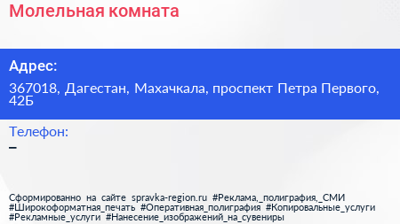 Молельная комната по адресу 367018, Дагестан, Махачкала, проспект Петра Первого, 42Б в дальнейшем Организация, размещена в следующих категориях: